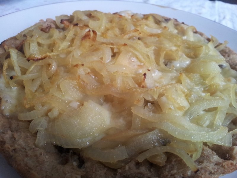 Nel frattempo tagliate a fette sottili le cipolle, versate l’olio d’oliva in una padella e ponete le cipolle. Cospargete di sale e pepe. Fate cuocere a fuoco lento sino a che saranno leggermente dorate (non abbiate fretta devono cuocere lentamente senza bruciarsi), potete anche aggiungere un poco di acqua man mano che si asciugano. Spegnete il fuoco e fate raffreddare.
